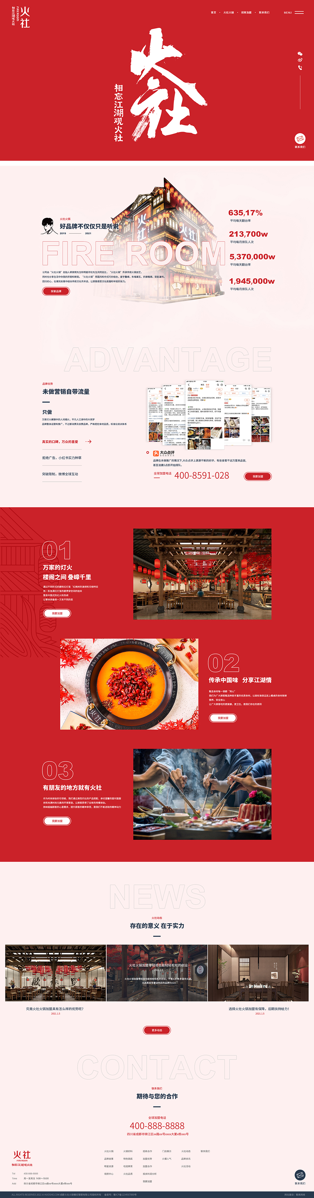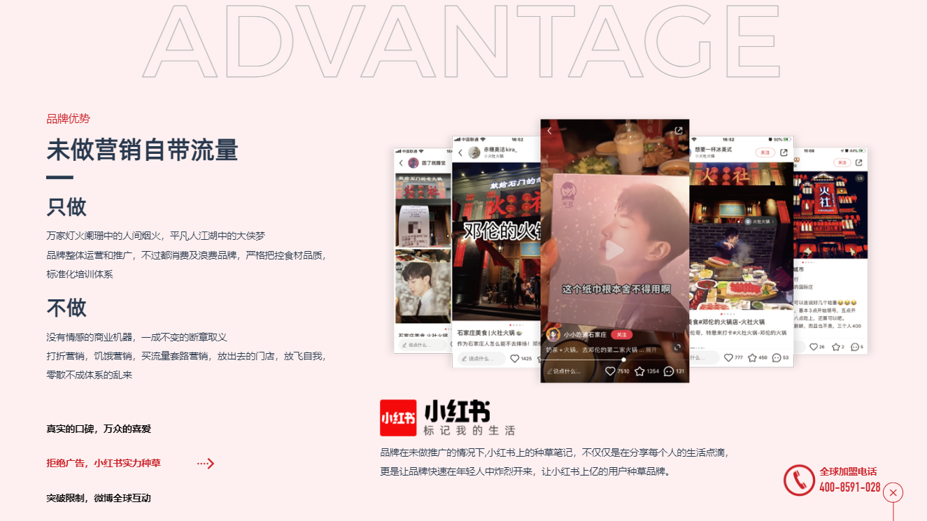許多想要加盟火社品牌的加盟商往往會(huì)比較重視一個(gè)品牌的運(yùn)營(yíng)、盈利能力,而人們對(duì)于數(shù)字的敏感度遠(yuǎn)高于其他文字,所以在本次網(wǎng)站建設(shè)的時(shí)候,我們特意把火社品牌的每天翻臺(tái)率、每月排隊(duì)人次、微博話題討論次數(shù)數(shù)據(jù)展示出來(lái),體現(xiàn)品牌的可持續(xù)能力。