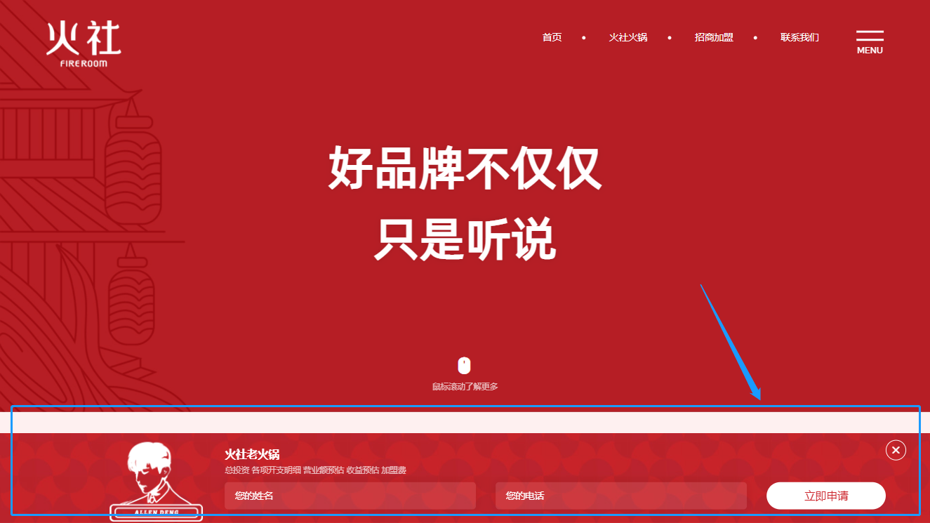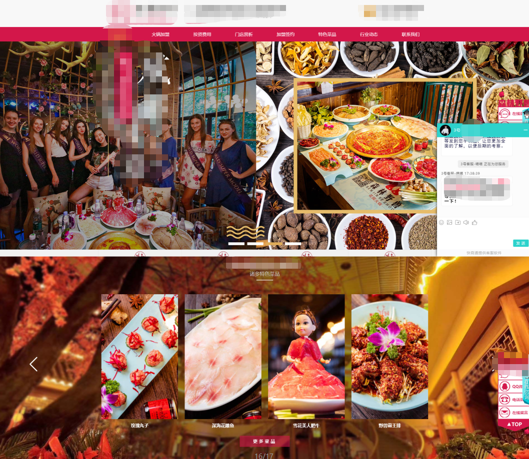 (愛(ài)蜀美極度注重用戶瀏覽網(wǎng)頁(yè)的舒適度和不被打擾性,非常反感一些營(yíng)銷(xiāo)工具的強(qiáng)制彈窗、反復(fù)彈出、狗皮膏藥似的占滿屏幕的四周,只保留必要的咨詢通道。所以我們只在網(wǎng)頁(yè)底部加入了一個(gè)加盟窗口,用戶可以隨時(shí)收縮/打開(kāi)窗口,在尊重用戶體驗(yàn)感的情況下,也體現(xiàn)了火社火鍋把服務(wù)放在首位的品牌理念↑)
